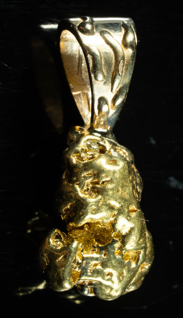Please note the pendant bale is made of 10Kt for durability on our smaller die struck or 14kt gold on our larger bales that are casted. They do not include a chain. Each Nugget is filmed next to a US quarter that is 24.5MM in diameter. We purchased the gold in a dirty form directly from the gold miners than clean it of dirt, rock quartz, and tumble them for shine. We test our nuggets by sound, torch, and scope and guarantee they are authentic and not man-made.